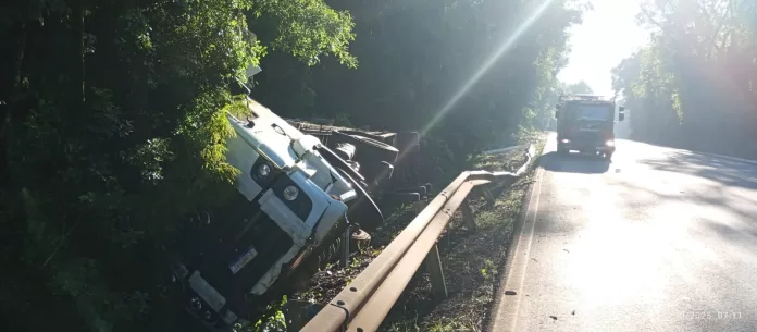 De acordo com as informações do 6º Batalhão de Bombeiros Militar, a ocorrência envolveu uma carreta Volkswagen, com placas padrão Mercosul, carregada com papelão. O veículo saiu da pista e parou em um barranco, sendo parcialmente sustentado por uma árvore.