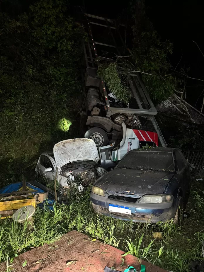 Um grave Acidente com Caminhão em Seara mobilizou o 6º Batalhão de Bombeiros Militar na noite desta quinta-feira (15). Por volta das 22h19, um caminhão cegonha saiu da pista na Rua Três de Abril, despencou de um plano superior e atingiu uma oficina mecânica, danificando diversos veículos que estavam no local.