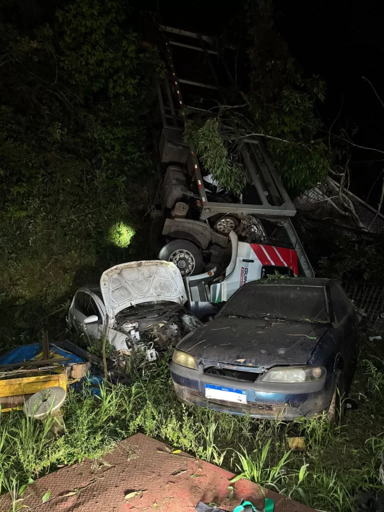 O impacto foi tão severo que a rede elétrica foi atingida, deixando o próprio quartel dos Bombeiros de Seara momentaneamente sem energia no momento do acionamento. Ao chegarem à cena, os socorristas confirmaram que o caminhão estava sobre a estrutura da oficina e de outros carros.