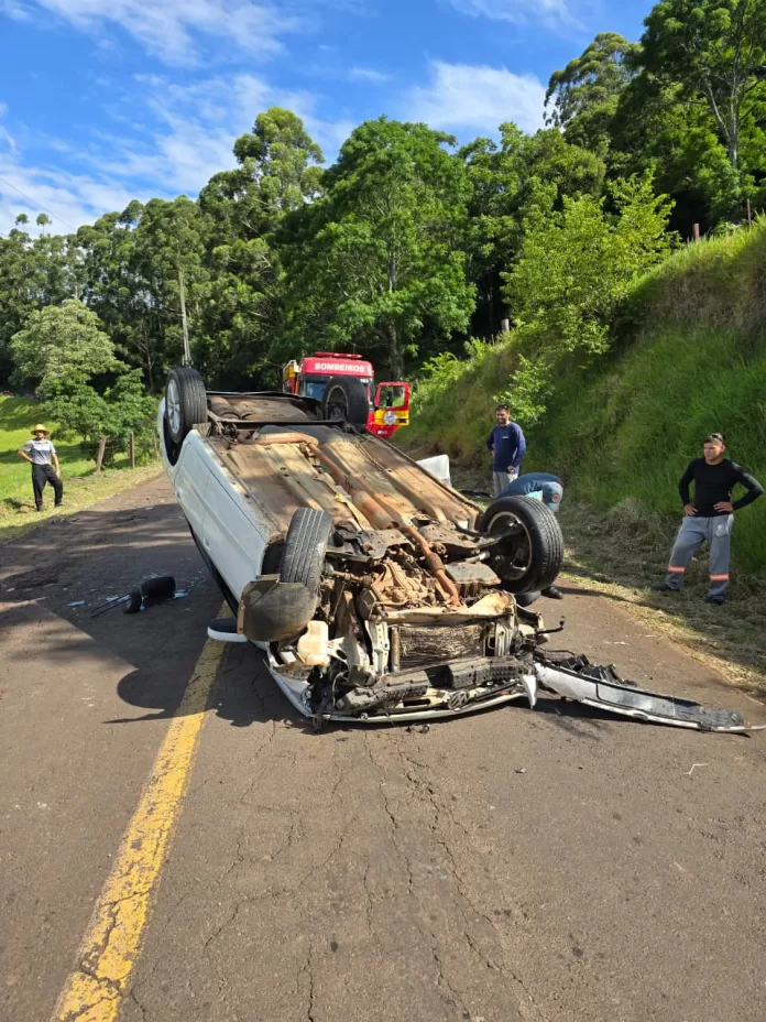 Um acidente de trânsito mobilizou o Corpo de Bombeiros de Xaxim na tarde deste sábado, 22. Foi uma saída de pista seguida de capotamento que ocorreu pouco depois das 15h, no acesso à Linha Bento, interior de Cordilheira Alta. Ao chegar ao local, as equipes encontraram um veículo Volkswagen Voyage, de cor branca, capotado sobre a via.