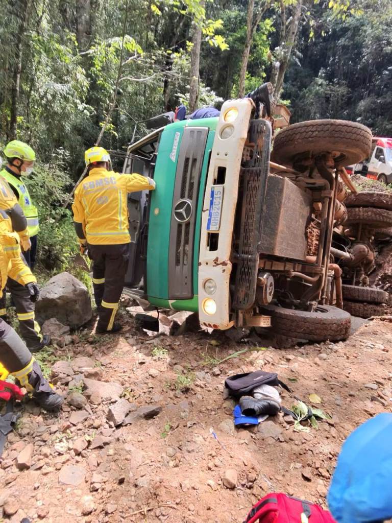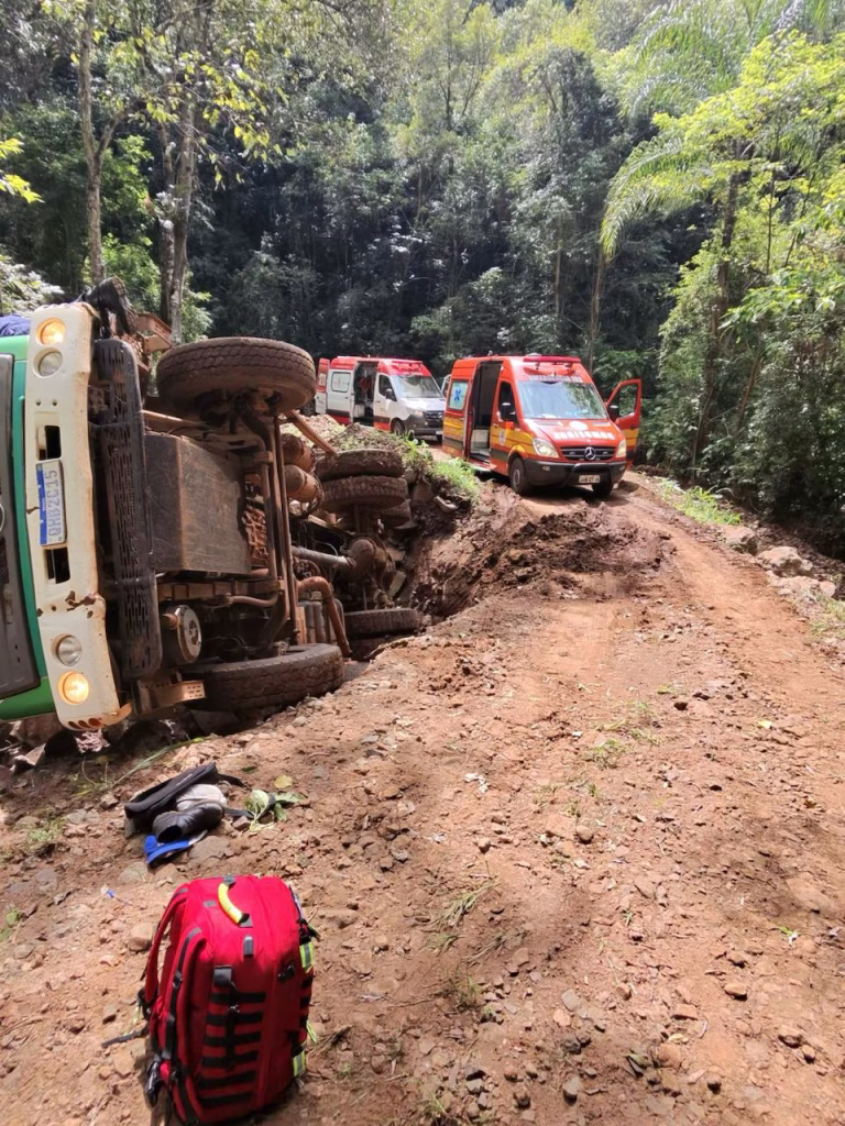 Foi localizada uma vítima do sexo masculino dentro do caminhão, preso em tipo físico 1. Com auxílio do Corpo de Bombeiros Militar de Santa Catarina (CBMSC) e da USA 03 do SAMU de Xanxerê, foi realizada a retirada da vítima, que foi protocolada e recebeu suporte ventilatório e analgesia durante o resgate de vítima em Xanxerê.