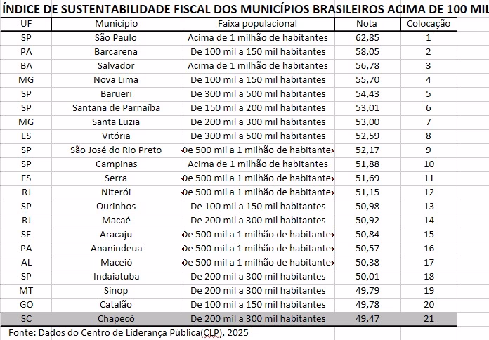 De acordo com o secretário de Desenvolvimento Econômico, Turismo e Inovação, Márcio Paixão Rodrigues, em 2025 o município foi o melhor do Sul e o 21º do país em sustentabilidade fiscal em Chapecó, segundo ranking do Centro de Liderança Pública, entre cidades com mais de 100 mil habitantes.