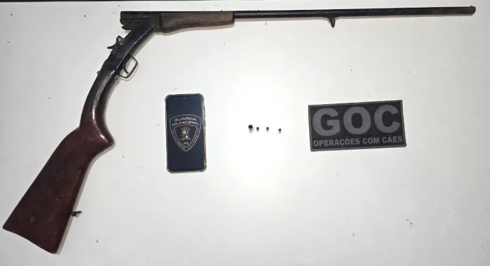 Os agentes encontraram diversos estojos de munição deflagrada na área externa de uma residência. Ao abrirem a porta do imóvel, visualizaram uma espingarda encostada na parede e o morador visivelmente embriagado.