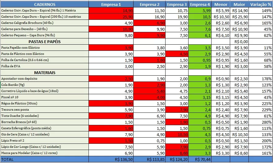 Veja o comparativo de custos totais para a compra dos 25 itens pesquisados: