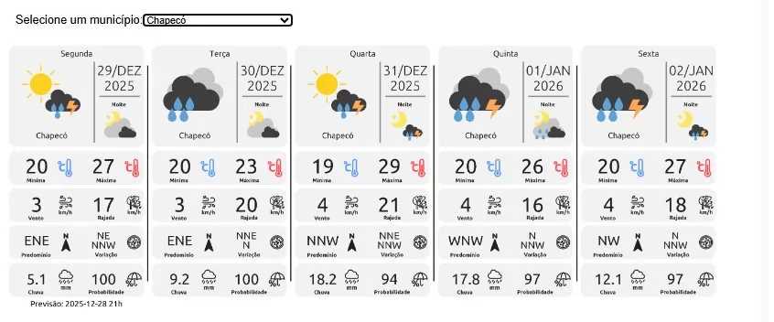 Temporais marcam a última semana de 2025 em Santa Catarina, alerta Defesa Civil