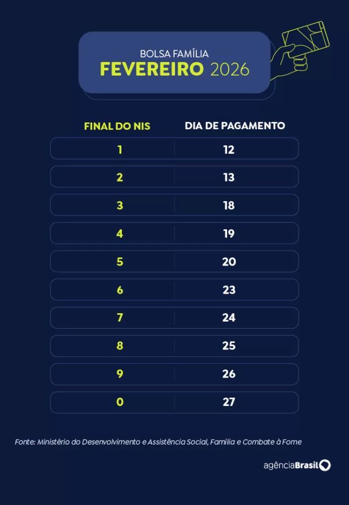 O calendário completo de fevereiro segue a numeração final do NIS e pode ser consultado nos canais oficiais da Caixa e do Ministério do Desenvolvimento e Assistência Social.
