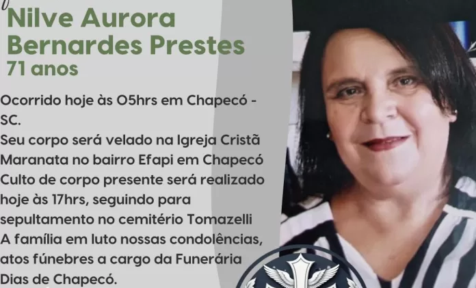 A família Bernardes Prestes lamenta o passamento da mãe, sogra, avó e bisavó, Nilve Aurora Bernardes Prestes, aos 71 anos de idade, ocorrido nesta madrugada, no Hospital Regional do Oeste, em Chapecó.