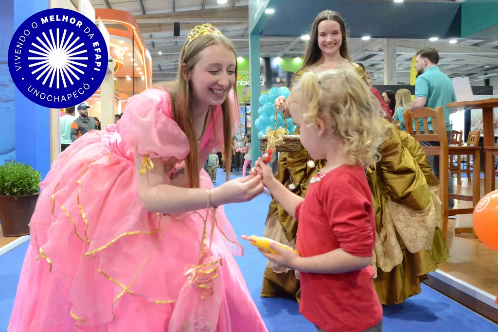 Mesmo com chuva, o público infantil aproveitou o dia na feira, participando de atividades promovidas pelo Literatório. Houve pintura facial, distribuição de balões e pirulitos, além de interação com personagens como princesas e a boneca falante Emília. Franciele Kuhn, coordenadora de Extensão da Uno, destaca que o projeto é presença fixa nas edições da Efapi, especialmente no Dia das Crianças, oferecendo alegria, encantamento e interação às crianças e adolescentes.