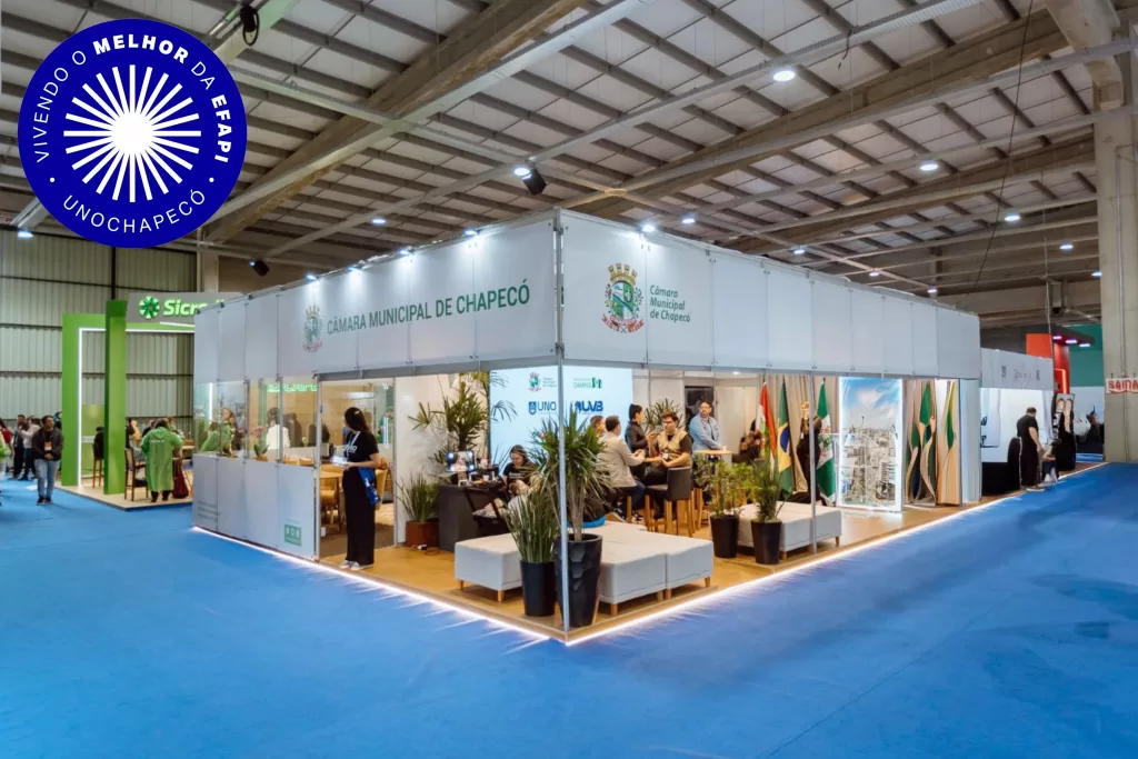 No domingo, 12 de outubro de 2025, a Unochapecó destacou sua presença na Efapi do Brasil, reunindo ações de extensão, cultura, debates e homenagens no estande da Câmara de Vereadores, em parceria com o projeto Literatório. O estande, idealizado por docentes de Arquitetura e Urbanismo e Engenharia Civil, com apoio da Agência Experimental de Design da Uno, reforça a integração entre ensino, extensão e sociedade, aproximando a comunidade do poder legislativo.