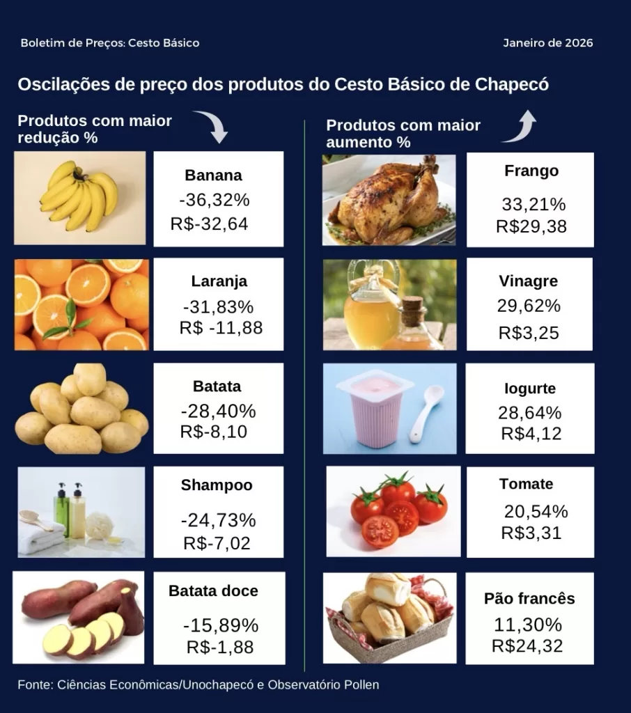 Economistas da Unochapecó alertam que o primeiro trimestre de 2026 exige um planejamento financeiro rigoroso. Além do custo da alimentação, as famílias enfrentam as despesas típicas de janeiro e fevereiro, como o IPVA, IPTU e a compra de material escolar (que já apresenta variações de até 280% no comércio local).