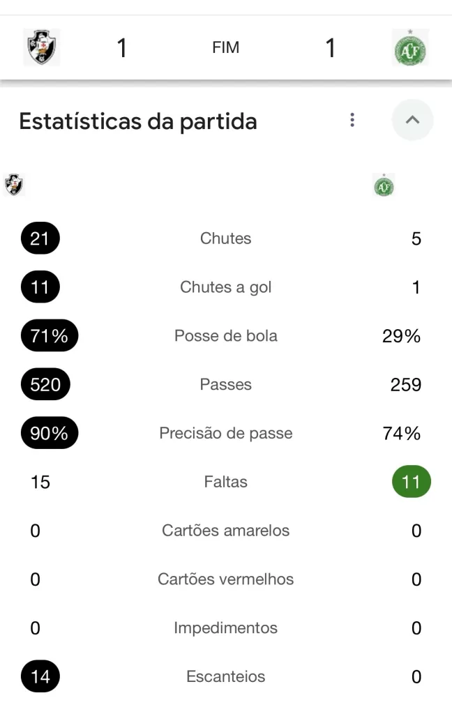 O Vasco saiu na frente no placar e manteve a vantagem até o final do jogo. Além disso, foi superior também nas finalizações, chutes a gols e tudo mais. Mas a Chapecoense tinha Jean Carlos em campo que, aos 45 minutos do segundo tempo cobrou falta de fora da área e colocou a bola na trave para depois entrar e dar o placar definitivo do jogo: 1 a 1.