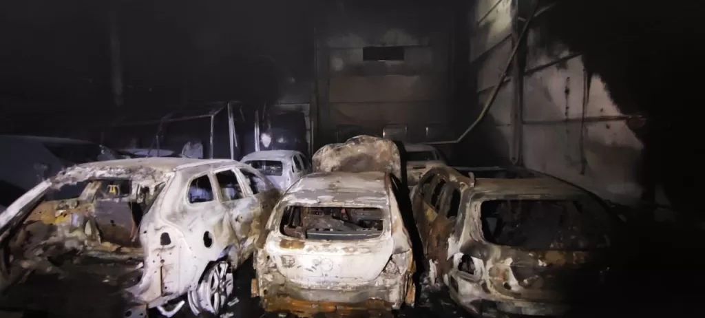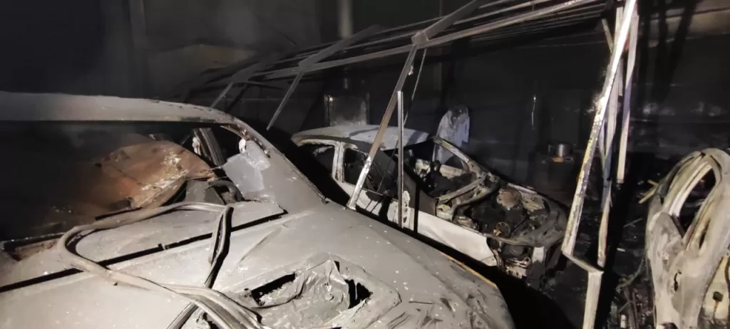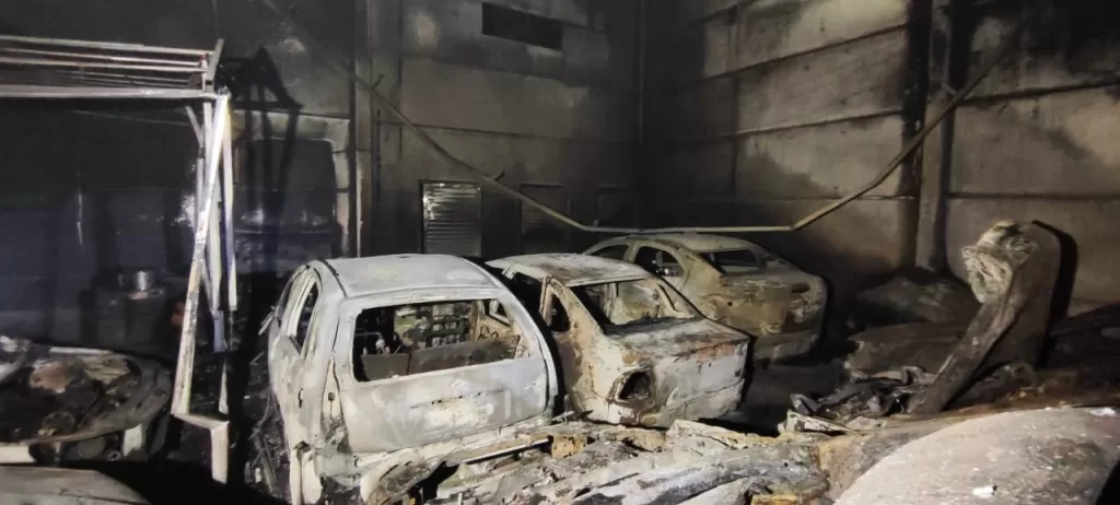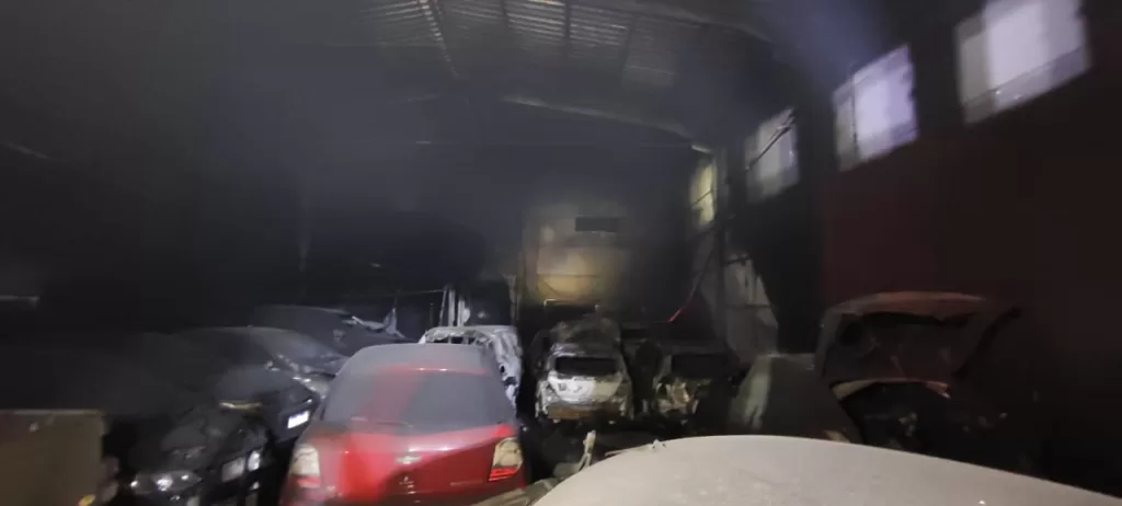 Em seguida, foi realizado o resfriamento e ventilação do ambiente para eliminar riscos de reignição. No interior da oficina havia 16 veículos, todos atingidos pelo fogo ou pelas altas temperaturas — alguns completamente queimados.