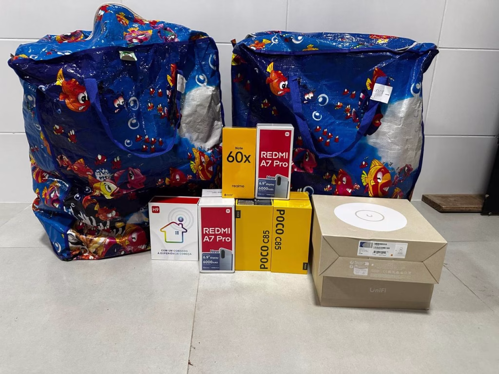 No bagageiro, foram identificadas mercadorias de outros dois passageiros, um de 31 e outro de 29 anos, que transportavam eletrônicos sem documentação fiscal e acima da cota permitida. Foram apreendidos smartphones, notebook e roteadores, avaliados em cerca de R$ 20 mil. As mercadorias foram encaminhadas à Receita Federal.