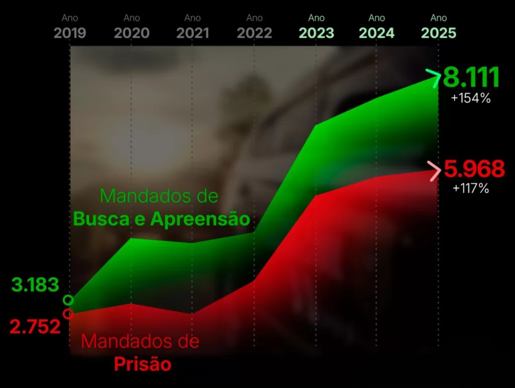 Os mandados de busca e apreensão apresentaram crescimento explosivo a partir de 2023. Enquanto em 2019 foram cumpridos 3.183 mandados até 17 de novembro, em 2023 esse número saltou para 7.114 no mesmo período.
